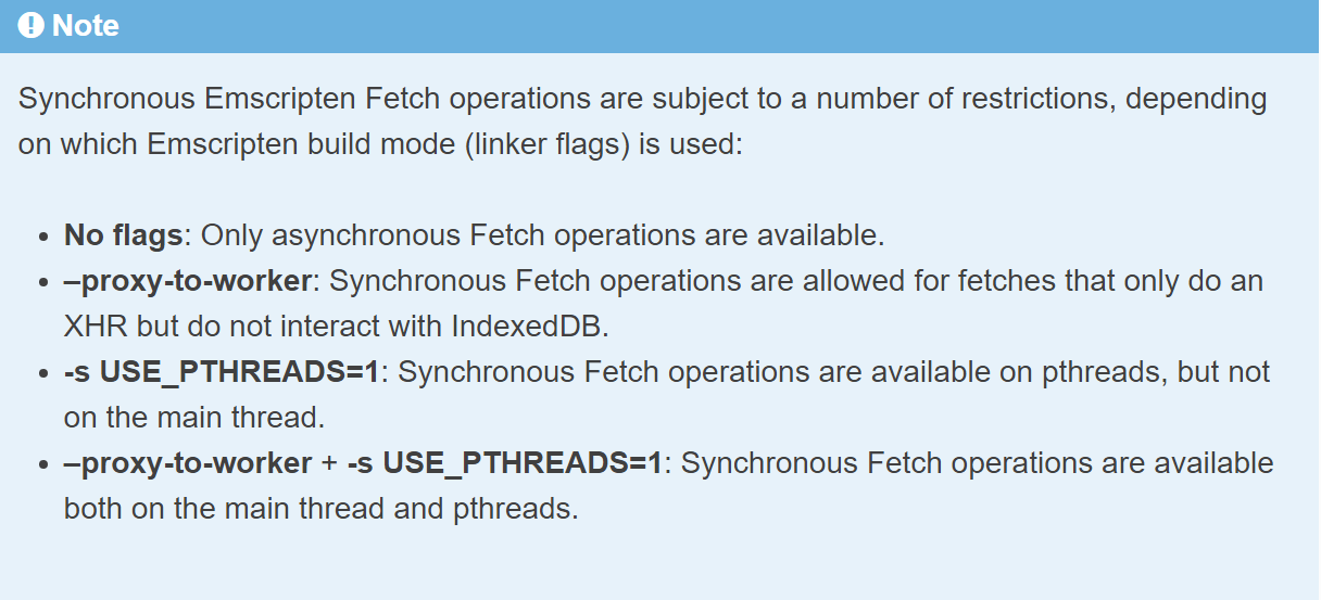 WASM 모듈이 PWA에서 사용하는 경우를 예상해서, 내부 리소스를 fetch를 이용하여 가져오기로 했다. 기본적으로 fetch API는 비동기 방식을 사용하도록 되어 있어서 동기식 방식을 확인했는데, 다행히도 지원하고 있었다. 그러나 아쉽게도 emscripten 문서에 따르면 아래와 같다. 특정 옵션을 주지 않으면, 사실상 비동기 방식만 지원함. 으로 요약 할 수 있다. 물론 옵션을 주면 된다는데, USE_PTHREAD 옵션을 사용하면, 현재 Apple Safari에서 지원 못하므로 해당 옵션을 사용할 수 없다. 하여 대안으로 wget을 선택 설명에는 Synchronously fetches data.. 라고 표기하고 있어서 fetch인가 했는데.. 브라우저 디버거의 네트워크 탭을 열어보면, xhr로 표..